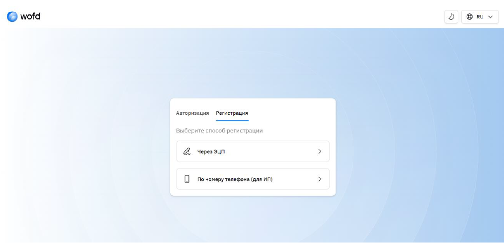 Для регистрации организации необходимо перейти во вкладку «Регистрация», где будут доступны 2 способа регистрации: через ЭЦП, по номеру телефона (для ИП).