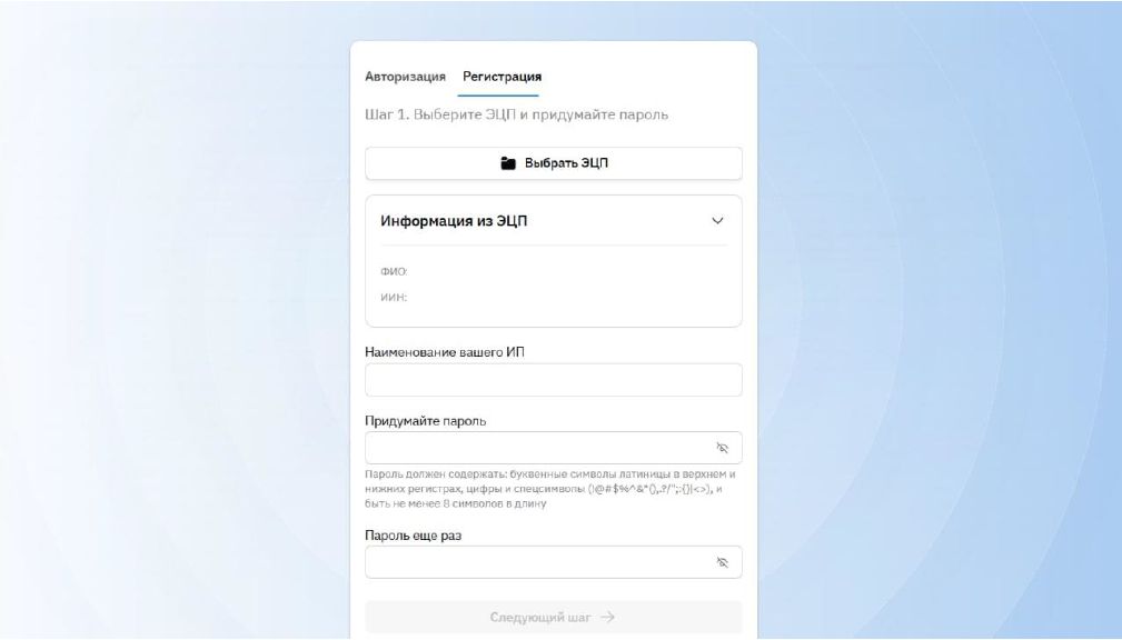 После загрузки ЭЦП отобразится окно, где необходимо будет ввести наименование организации, задать пароль и перейти к следующему этапу регистрации.