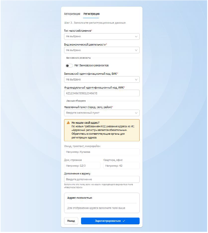 1. Перейти в раздел регистрация ввести свои учетные данные (БИН, Наименование, Юр. Адрес, Орг правовую форму, КОД ОКЭД, Если плательщик НДС то серию и номер НДС).