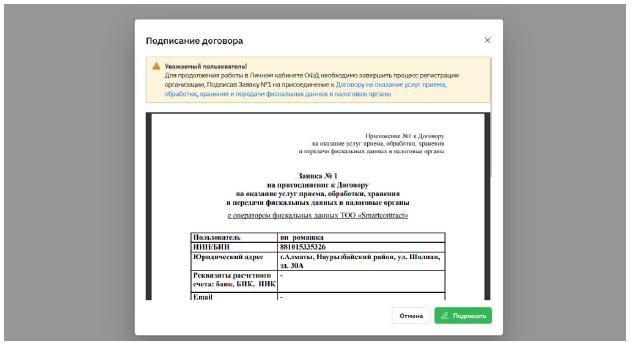 ВАЖНО! Для полноценной работы в системе необходимо завершить процесс регистрации организации, подписав Заявку №1 на присоединение к «Договору на оказание услуг приема, обработки, хранения и передачи фискальных данных в налоговые органы». Подписать заявку можно с использованием файла ЭЦП, через приложение eGov Mobile (для индивидуальных предпринимателей и физических лиц) или с помощью СМС-кода (доступно только для индивидуальных предпринимателей).