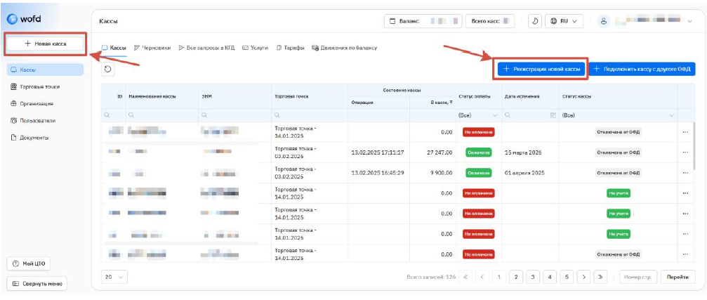Для регистрации кассы необходимо нажать на кнопку «+Регистрация новой кассы» в разделе «Кассы» или через «+Новая касса» в меню слева.