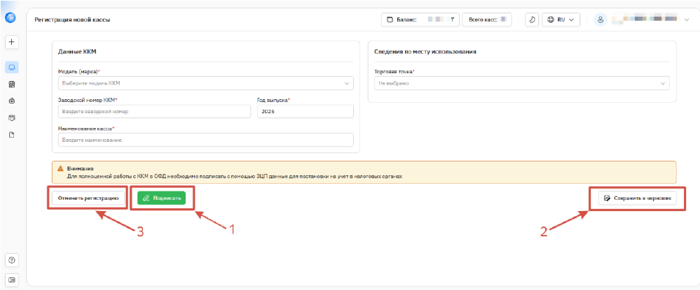 Откроется окно, где необходимо заполнить данные ККМ (Модель, ЗНК, Наименование, год выпуска), выбрать торговую точку, или создать новую. Ниже доступны кнопки 1.«Подписать» для отправки запроса на регистрацию, 2.«Сохранить в черновик» для продолжения регистрации позднее, и 3.«Отменить регистрацию».