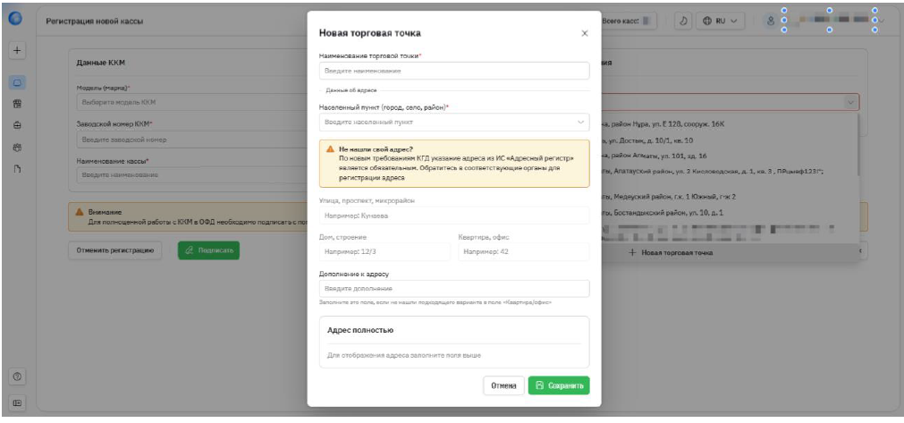 Откроется окно с возможностью ввода данных по новой торговой точке. Необходимо заполнить все обязательные поля и сохранить.