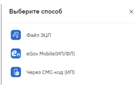 • eGov Mobile (ИП/ФЛ) если вы индивидуальный предприниматель или физическое лицо и используете приложение eGov Mobile для хранения ЭЦП, выберите этот вариант.;
