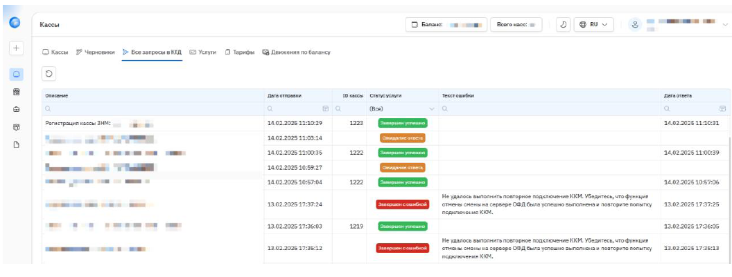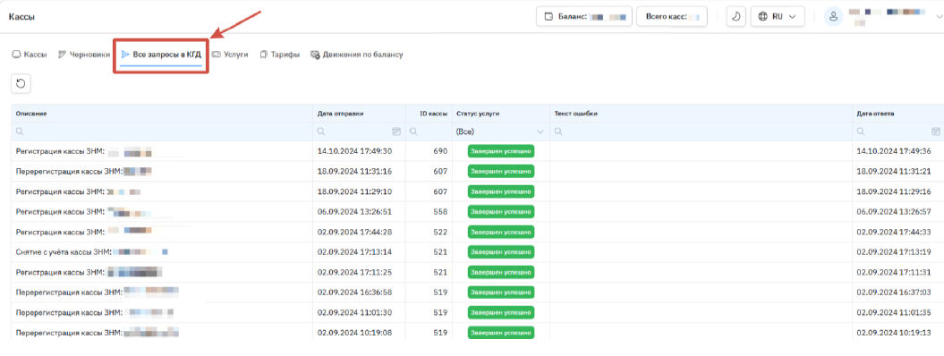 Во вкладке «Все запросы в КГД» отображается история запросов отправленные в КГД с соответствующим описанием и статусом. Так же, здесь можно отслеживать актуальные статусы запросов по кассам.