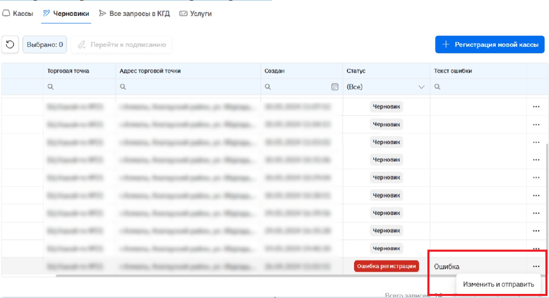 Заявки на регистрацию ККМ, завершенные с ошибкой, будут перемещены в раздел «Черновики». Для редактирования и повторной отправки заявки на регистрацию выберите нужный черновик ККМ и нажмите на кнопку «...» в соответствующем столбце, затем выберите опцию «Изменить и отправить».