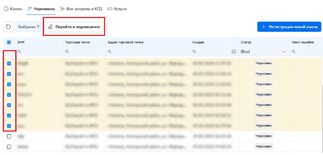 Имеется возможность выбора нескольких/всех ККМ из раздела «Черновики» для последующей отправки данных в налоговые органы для постановки выбранных ККМ на учет. Для этого, необходимо отметить нужные кассы, используя чекбоксы в первом столбце, а затем нажать кнопку «Перейти к подписанию».